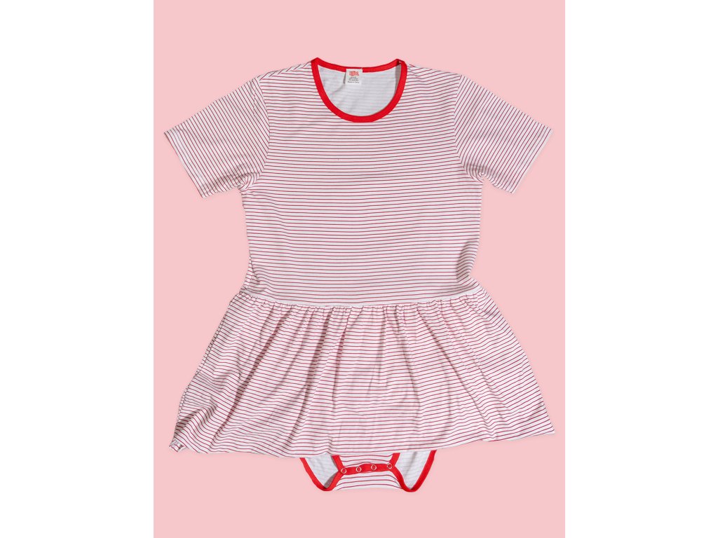 Díky kulatému výstřihu a nadčasovým proužkům dodává outfitu jednoduchý, elegantní nádech. Integrovaná sukně přidává šarmantní detail – ideální pro ležérní styl. Zapínání na druky v rozkroku usnadňuje oblékání i svlékání.