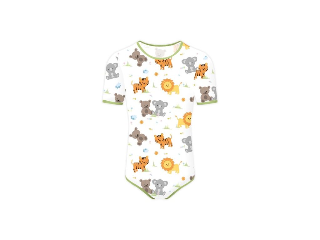 Body má krátké rukávy a 4 patenty v rozkroku pro snadnou výměnu plenky.