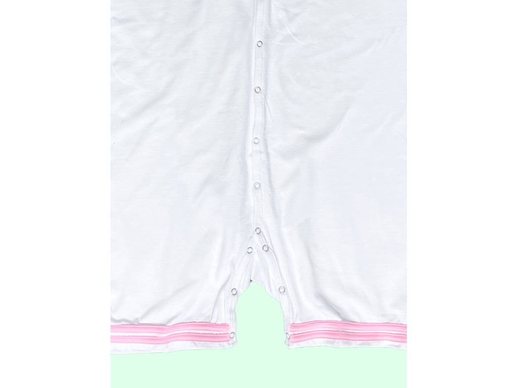 Zábavný nový overal vyrobený z materiálu složeného z 95 % bavlny a 5 % spandexu – s velkou pružností ve dvou směrech. Má všitý klín v rozkroku pro větší prostor při nošení plen. Výstřih je vpředu opatřen kovovým drukem, další kovové druky jsou v rozkroku. Díky obsahu spandexu je látka velmi pružná, takže si můžete pořídit menší velikost, než obvykle nosíte – látka se natáhne a přilne k tělu, čímž pomůže udržet plenu na místě.