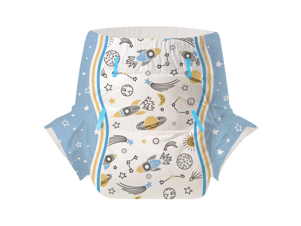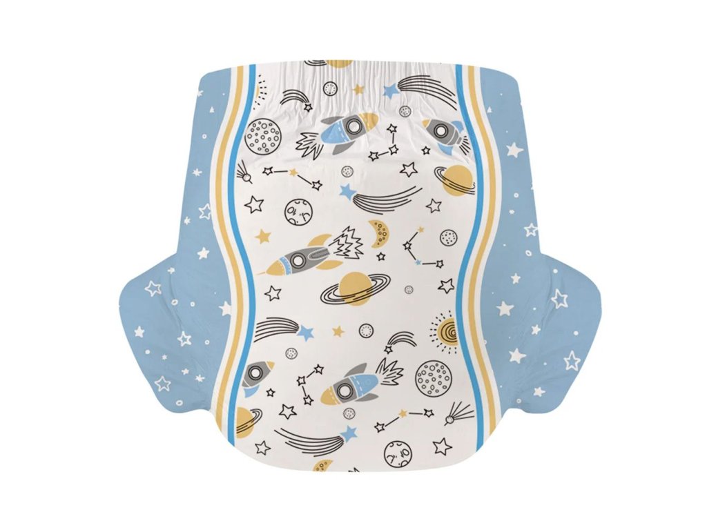 Ve vesmíru není slyšet šustění, na Zemi ale ano. Plenky Cosmic Adventurer mají příjemně decentní vesmírný motiv na fólii.